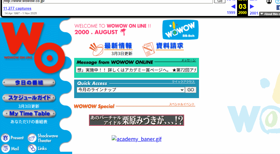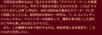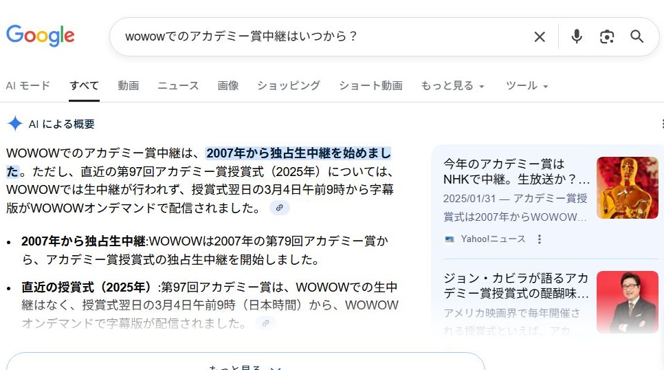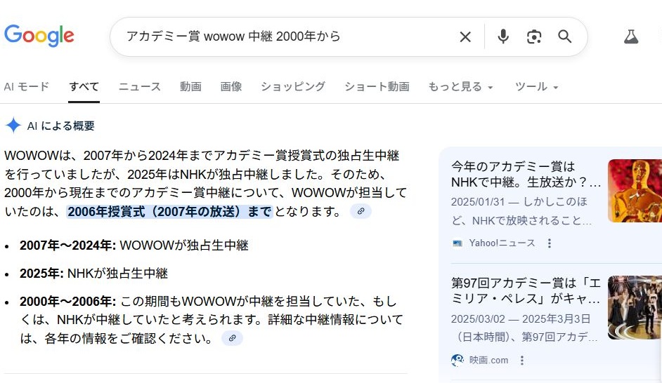 ちなみにここまでで得た情報で検索すると2000年からWOWOWでのアカデミー賞独占生中継が始まったというオリコンの正しく書かれた記事も見つかりました