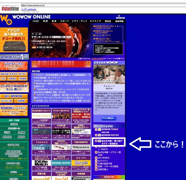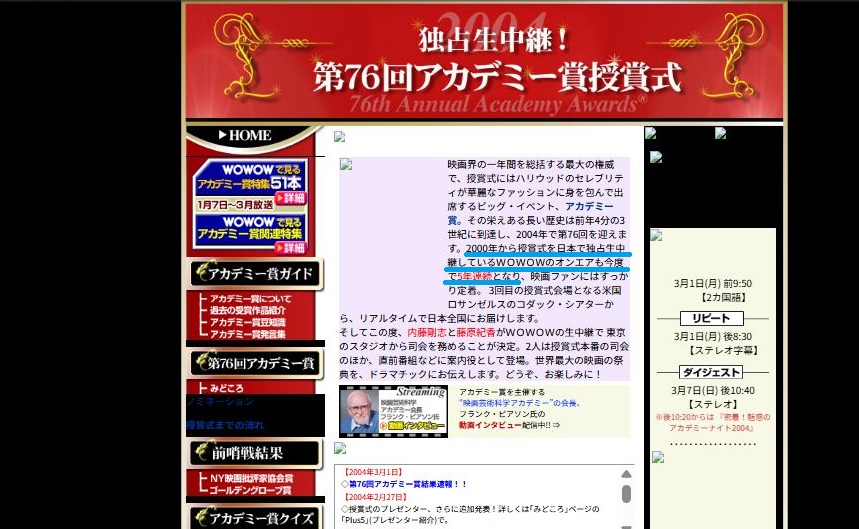 そして見つけた2004年のアーカイブの右端の”独占生中継第76回アカデミー賞授賞式”の文字をクリックしてリンク先に飛ぶと